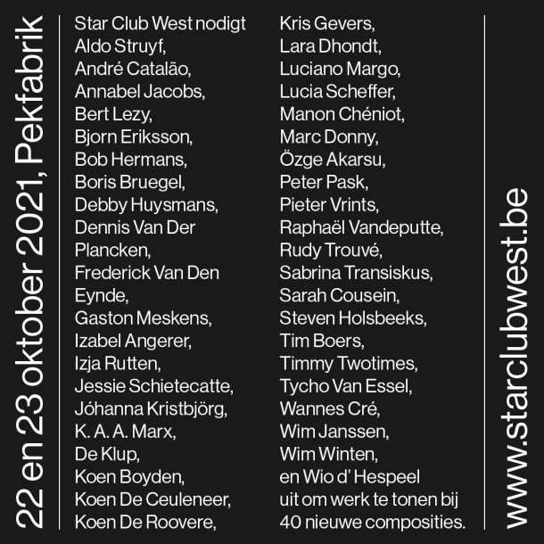 Aldo Struyf, André Catalão, Annabel Jacobs, Bert Lezy, Bjorn Ericksson, Bob Hermans, Boris Bruegel, Debby Huysmans, Dennis Van Der Plancken, Frederick Van Den Eynde, Gaston Meskens, Izabel Angerer, Izja Rutten, Jessie Schietecatte, De Klup, Jóhanna Kristbjörg, Koen Boyden, Koen De Ceuleneer, Koen De Roovere, Kris Gevers, K. A. A. Marx, Lara Dhondt, Luciano Margo, Lucia Scheffer, Manon Chéniot, Marc Donny, Özge Akarsu, Peter Pask, Pieter Vrints, Raphaël Vandeputte, Rudy Trouvé, Sabrina Transiskus, Sarah Cousein, Steven Holsbeeks, Tim Boers, Timmy Twotimes, Tycho Van Essel, Wannes Cré, Wim Janssen, Wim Winten, Wio d’ Hespeel