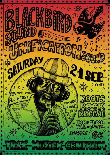 Na een lange zomerpauze landt Blackbird Sound opnieuw in Trix. Deze keer nodigen ze het Gentse Unification Sound uit, die er met hun roots/dub selectie voor zullen zorgen dat stilstaan quasi onmogelijk wordt. Smeer die benen dus alvast in en don't forget to put on your dancing shoes!