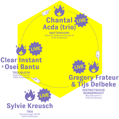 Koop je bijvoorbeeld tickets met startpunt Matterhorn? Dan ziet jouw planning er als volgt uit: 18u Chantal Acda (trio) in Matterhorn, 19u Gregory Frateur & Tijs Delbeke in het Districtshuis, 20u Clear Instant x Osei Bantu in Troubleyn.
