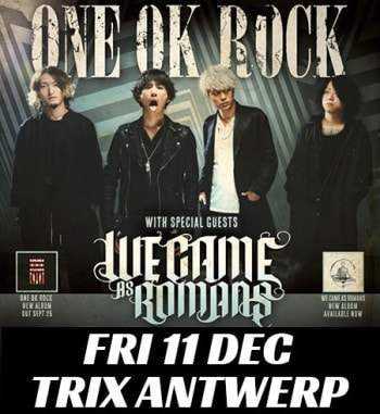 De One Ok Rock + We Came As Romans show in Trix Antwerpen op vrijdag 11 december zal wegens onvoorziene omstandigheden UITGESTELD WORDEN! Reeds aangekochte tickets voor dit concert blijven geldig voor de nieuwe datum. Organisator Biebob zal aan de ticektkopers zo snel mogelijk de nieuwe datum communiceren.