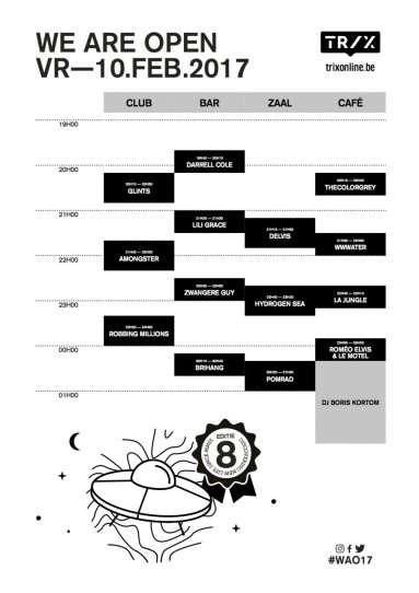 De editie van 2016 was volledig uitverkocht. Met onder meer Bazart op de affiche, net voor de grote doorbraak, bewezen we de vinger aan de pols te hebben in het hedendaagse poplandschap. Wie er vroeg bij wil zijn om nieuwe sensaties te leren kennen, krijgt op We Are Open 2017 opnieuw de kans om ontdekkingen te doen.