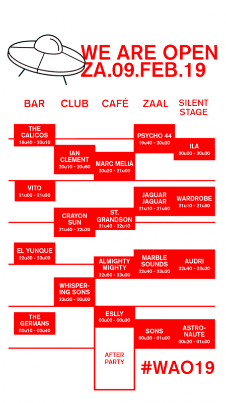 Op vrijdag 8 en zaterdag 9 februari organiseren we de elfde editie alweer van ons showcasefestival We Are Open. Gedurende twee avonden programmeren we alleen maar Belgische bands die je op vier verschillende podia aan het werk kan zien. In totaal zullen meer dan 30 acts zich aan het grote publiek komen voorstellen, waarbij we op vrijdag eerder focussen op het beste uit de Belgische urban en electronica-scene, terwijl we op zaterdag de nadruk leggen op 's lands betere gitaarwerk.