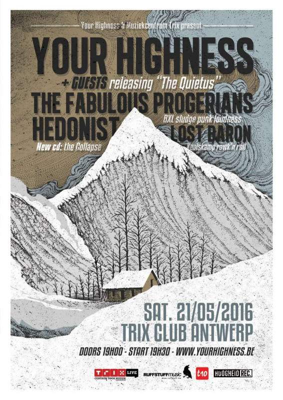 Voor deze gelegenheid kregen de heren van Your Highness carte blanche om nog enkele bands te programmeren op deze avond. Dat zijn uiteindelijk Hedonist, The Progerians en Lost Baron geworden.
